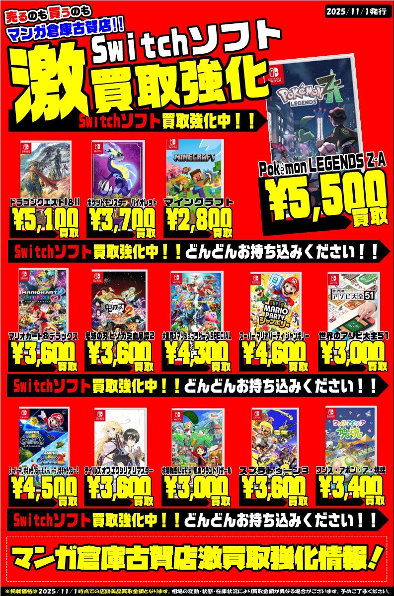 ☆★Switchソフト買取チラシ更新!★☆ #福岡 #ゲーム #買取 new 買取情報 イベント情報 2025年11月1日 Switchソフト買取チラシ更新しました‼️ ご来店をお待ちしております✨ ※2025/11/1 現在の価格となります。 在庫状況などによってお値段が変動いたします。予めご了承ください。 **************** こちら↓もぜひチェックしてみてくださいね♪(*´▽`*) ・最新の買取情報はこちら ・最新のイベント情報はこちら 関連