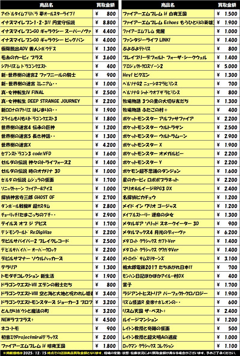 3DSソフト買取チラシ更新!#福岡 #ゲーム #買取 new 買取情報 ゲーム 2025年12月15日 3DSソフト買取チラシ更新しました‼️ ご来店をお待ちしております✨ ※2025/12/15 現在の価格となります。 在庫状況などによってお値段が変動いたします。予めご了承ください。 **************** こちら↓もぜひチェックしてみてくださいね♪(*´▽`*) ・最新の買取情報はこちら ・最新のイベント情報はこちら 関連