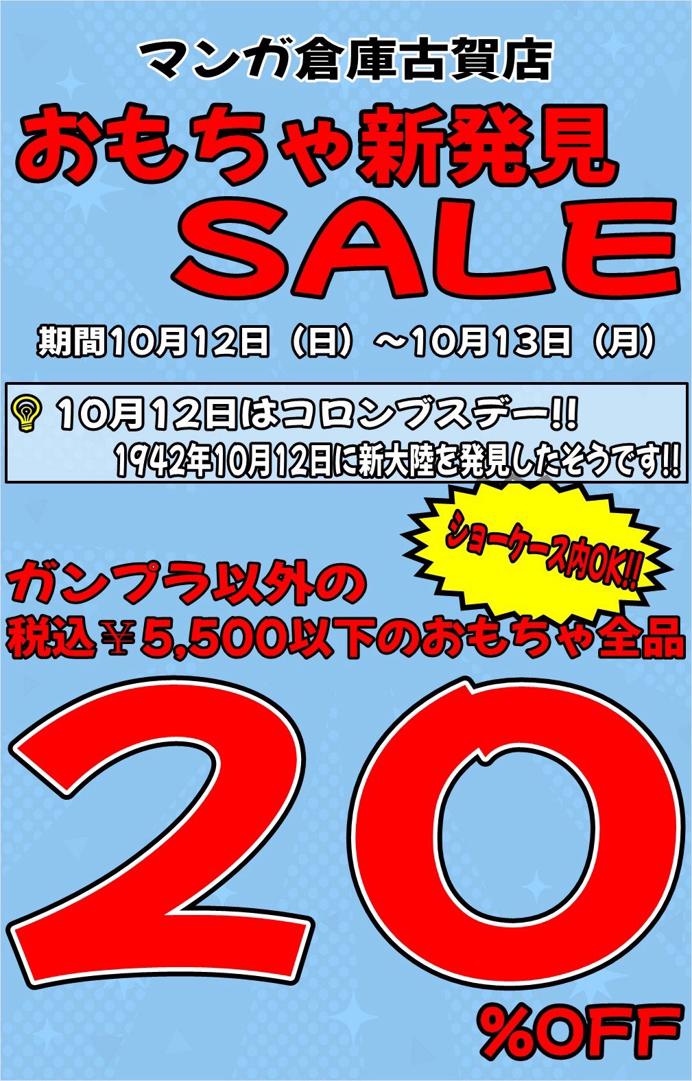 おもちゃSALE開催‼️ #おもちゃ好きと繋がりたい #SALE #推し活 #古賀 #マンガ倉庫 new イベント情報 おもちゃ 2025年10月12日 10/12(日)〜10/13(月)は“コロンブスデー”にちなんで—— 新しい「推し」を発見しよう🌎✨ ガンプラ以外・税込¥5,500以下のおもちゃが【20%OFF】‼️ ショーケース内もOK👀💥 関連