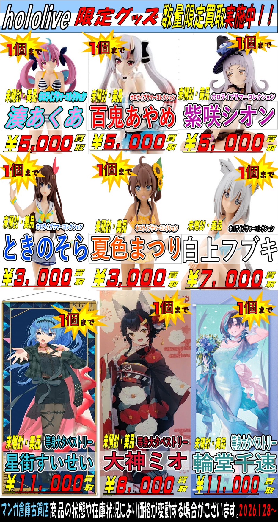 ホロライブ限定グッズ買取強化‼️ 買取情報 おもちゃ 2026年2月1日 ホロライブの限定グッズであるホロライブサマーコレクションフィギュアや等身大タペストリーを買取強化します❗️ 等身大タペストリーはあまり見かけないのでめちゃくちゃ欲しいです‼️ 是非マンガ倉庫古賀店へお持ち込みください☺️ ※2026/2/1 現在の価格となります。 在庫状況などによってお値段が変動いたします。予めご了承ください。 **************** こちら↓もぜひチェックしてみてくださいね♪(*´▽`*) ・最新の買取情報はこちら ・最新のイベント情報はこちら 関連